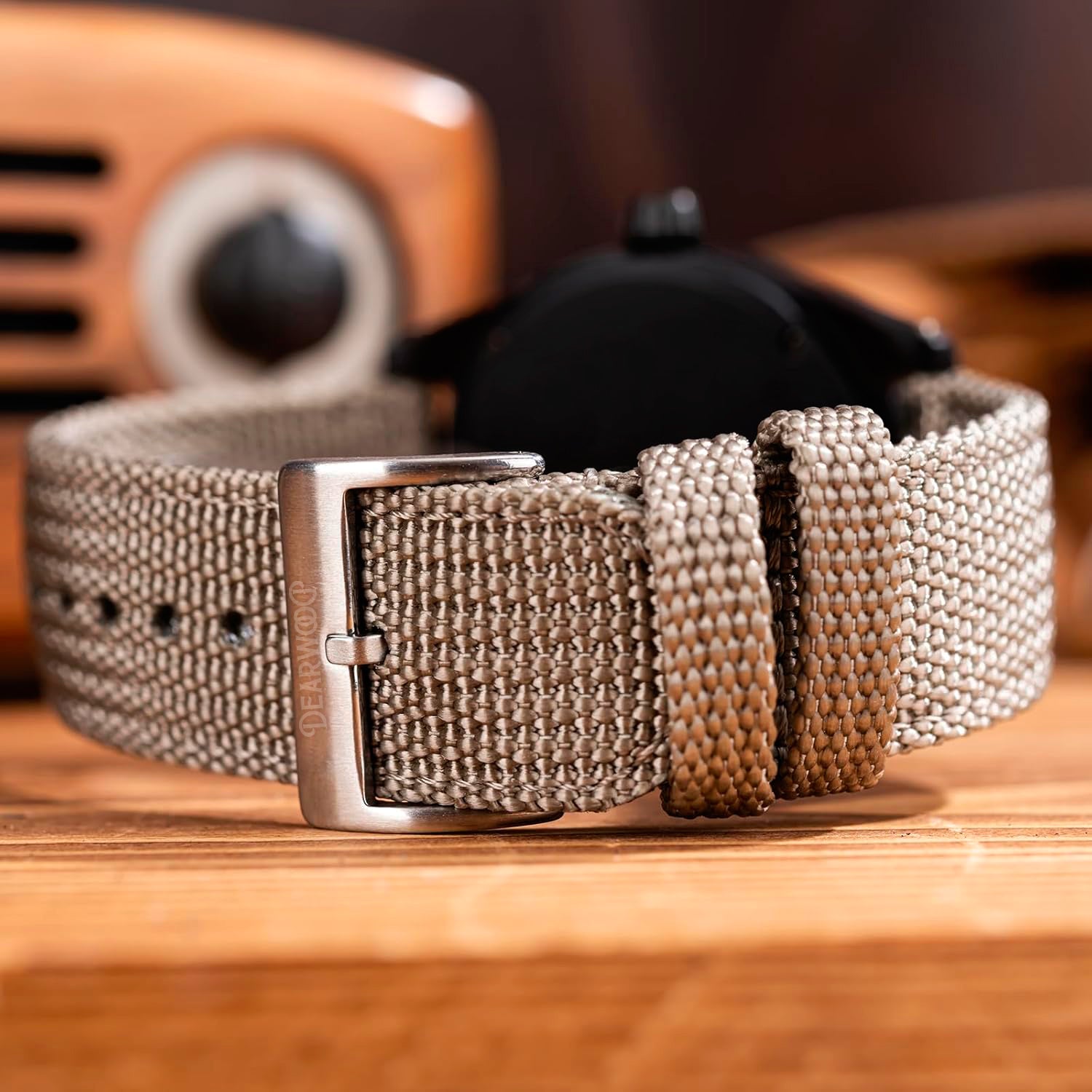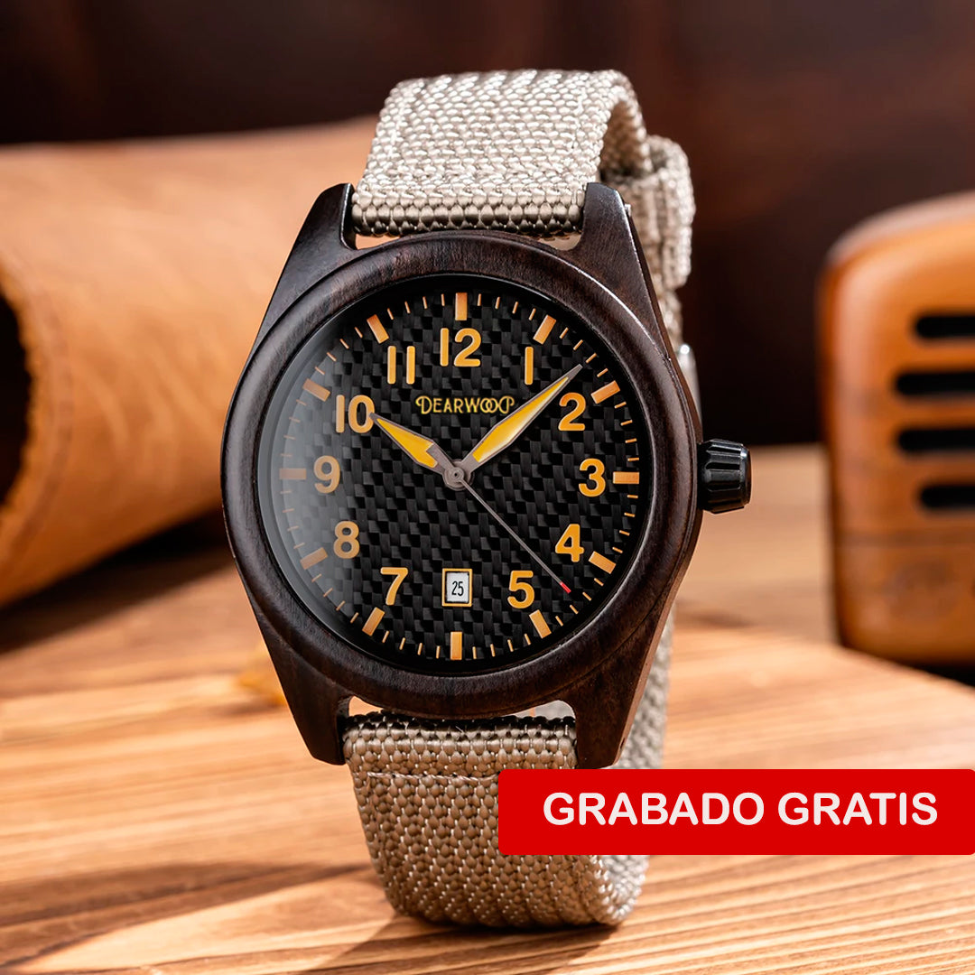 Reloj para hombre con grabado personalizado gratis, fabricado a mano con madera natural y equipado con una correa de nylon resistente. Ligero, suave y cómodo de llevar, es el regalo perfecto para quienes buscan un detalle único y especial. Su diseño combina a la perfección un estilo vintage con un toque sofisticado. Cuenta con números grandes para una lectura clara y una ventana de calendario que muestra la fecha.