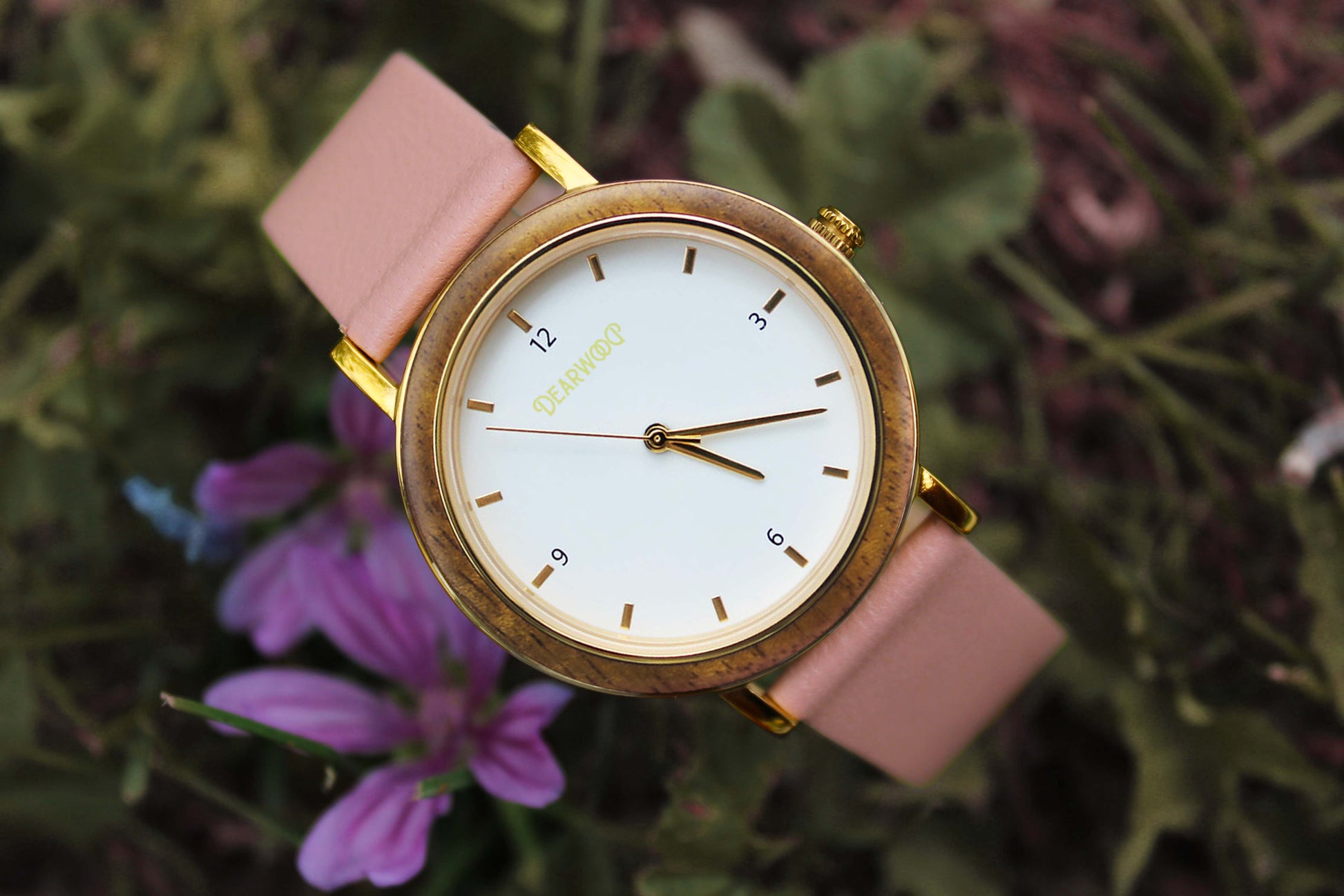 Reloj de madera con grabado personalizado gratis, fabricado a mano para mujer con madera natural y acero inoxidable, posee un diseño pequeño, sencillo y muy ligero. Destaca simple vista su combinación de colores de rosado y su estructura en color dorado con un pequeño detalle en madera en su dial , cabe mencionar que su correa esta fabricada en eco cuero color rosado.