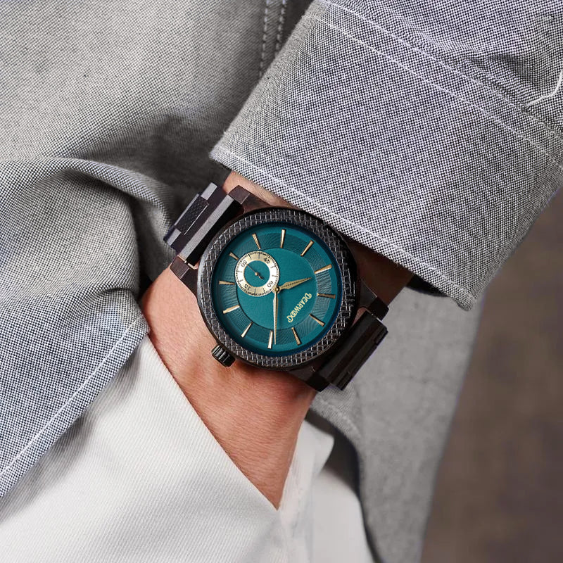 Reloj de madera con grabado personalizado gratis, fabricado a mano para hombre de diseño elegante y natural, fabricado en madera oscura con vetas únicas que lo hacen irrepetible. Su esfera azul profunda contrasta con detalles dorados, ofreciendo una lectura clara. El reloj además posee un segundero independiente y el bisel texturizado aportan un toque clásico y moderno a la vez.